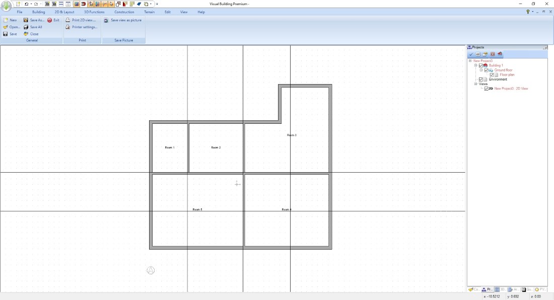 All views in Visual Building come from the internal 3D model, no matter if 2D floor plan, 2D sections or elevation views. Even if you do not need a 3D view, it still exists and when you draw walls in your floor plan everything is already in 3D. And the good thing is, it happens automatically whether you need it or not.