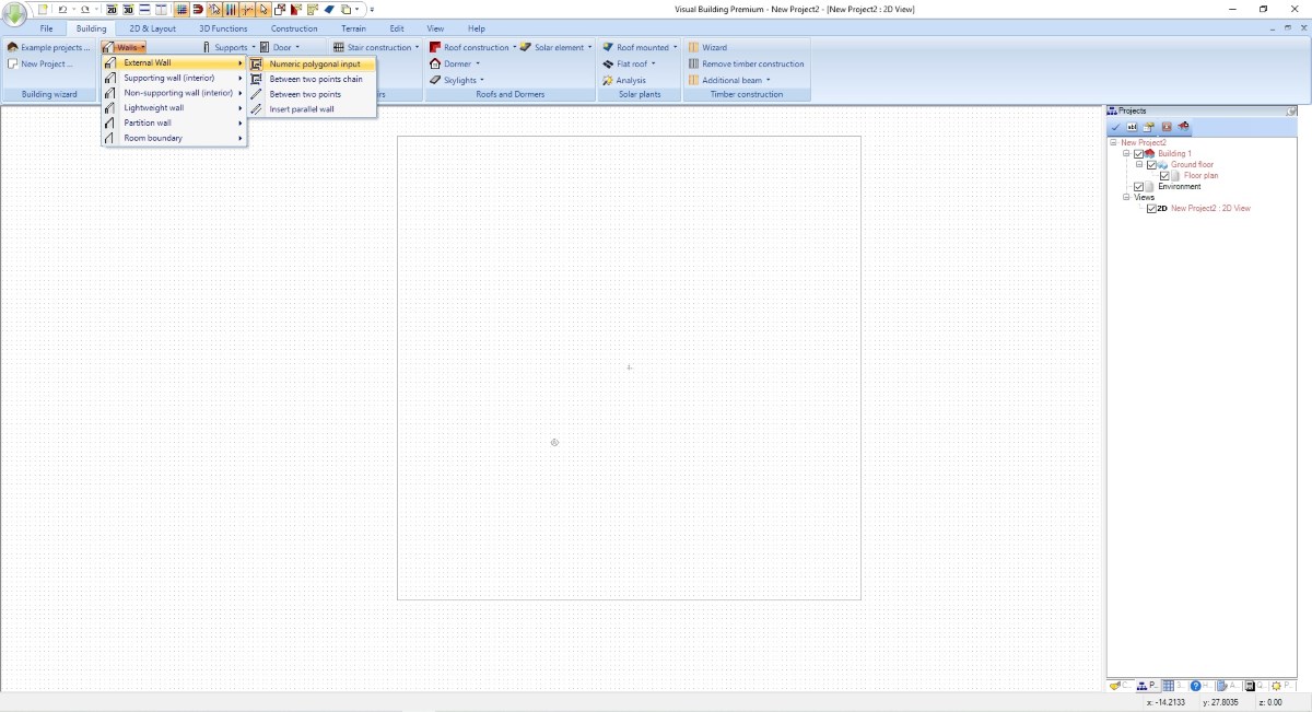 - Start the wall input tool, in this case “Exterior wall –numeric polygonal input”