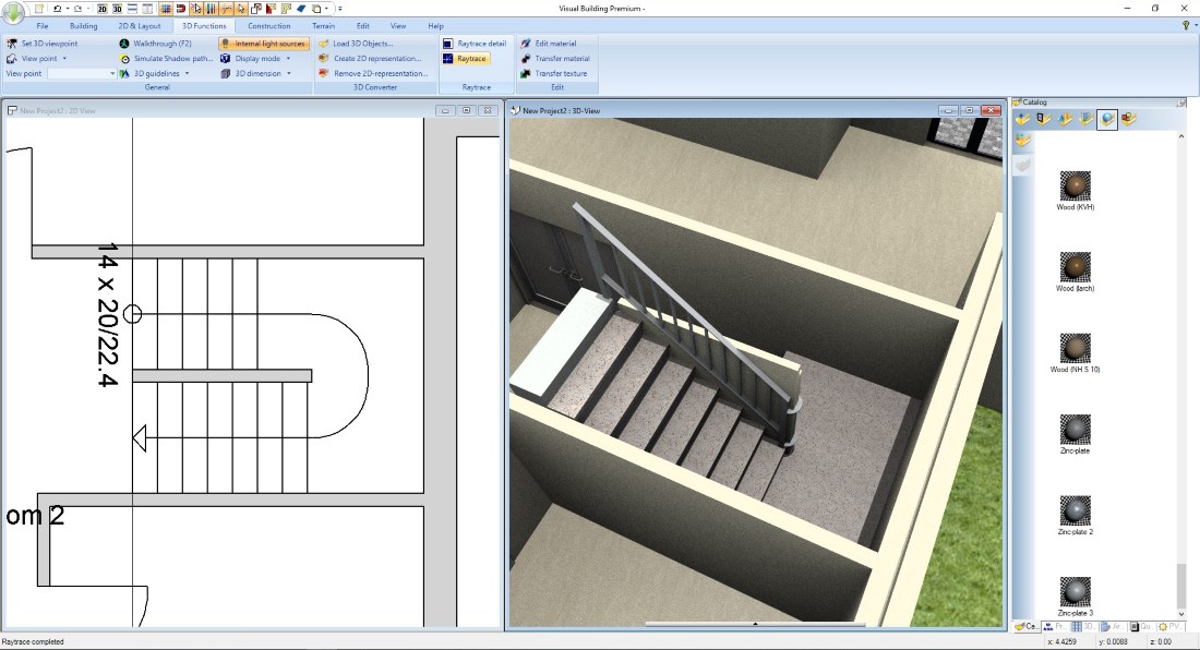 As with all other 3D elements in Visual Building, you change the materials of stairs by dragging and dropping a texture from the catalog onto it in a 3D View.