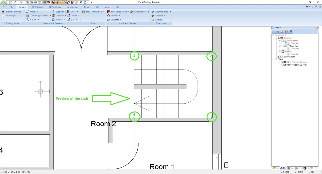 As soon as the right side of the stair is active, click on the corner points of the walls in the order as shown in our example image. While inserting the stair polygon, you will see a preview of the future stair for your orientation. Once you have set the last point, finish the process with ENTER or via the context menu on your right mouse button.