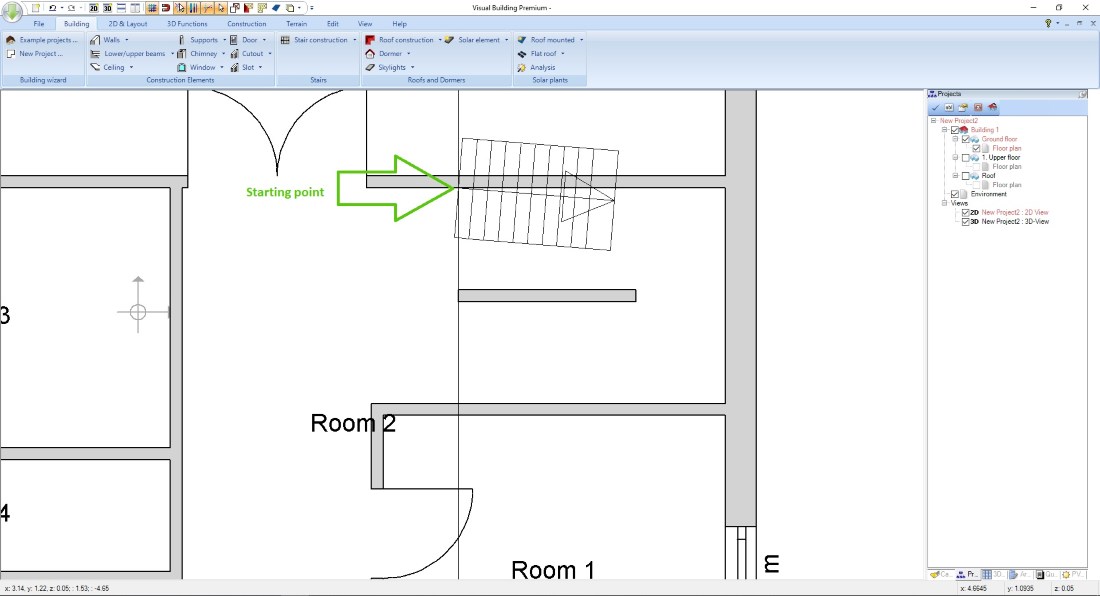 - Check whether the correct layer is active in our project viewer on the right side of the software. The active layer is highlighted in red. If you want to create a stair from the ground floor to the first floor, you have to activate the Ground Floor – Floor Plan layer first